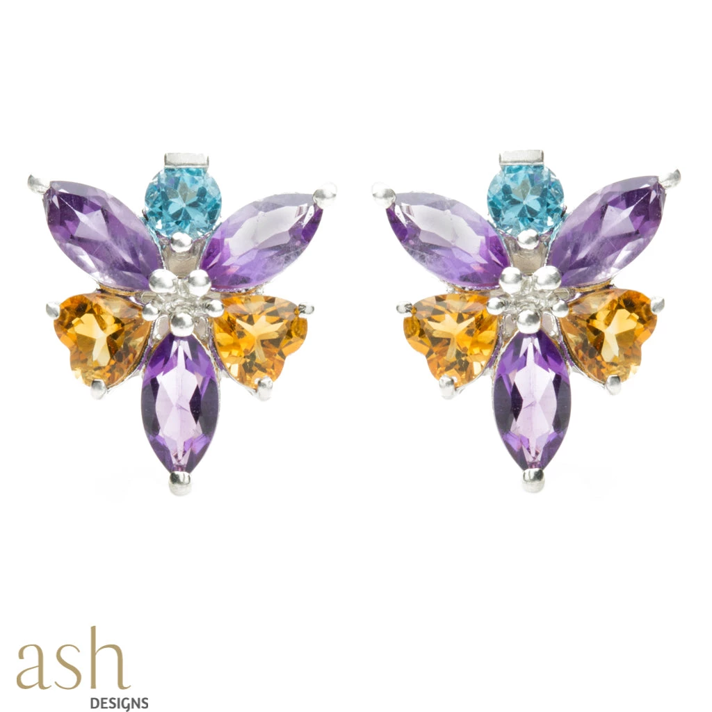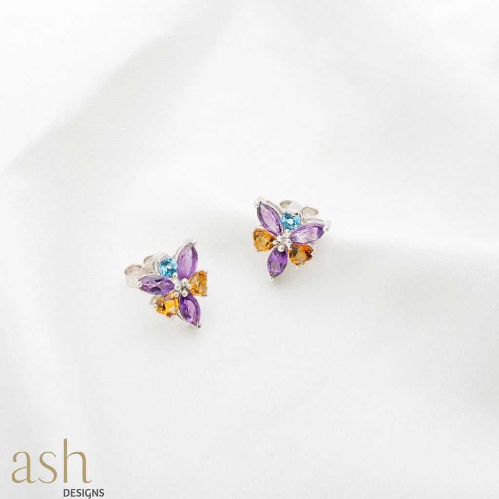 The lotus flower emerges from murky waters perfectly clean and beautiful. Taking inspiration from this symbol of purity, presenting to you ‘Peora’, a dainty pair of studs with fine marquis cut Amethyst, round Blue Topaz and heart-shaped Citrine gemstones set in silver. The earrings are a perfect piece of bling to add that something extra to an outfit. Surprise your wife or girlfriend on her birthday with this beautiful gift.