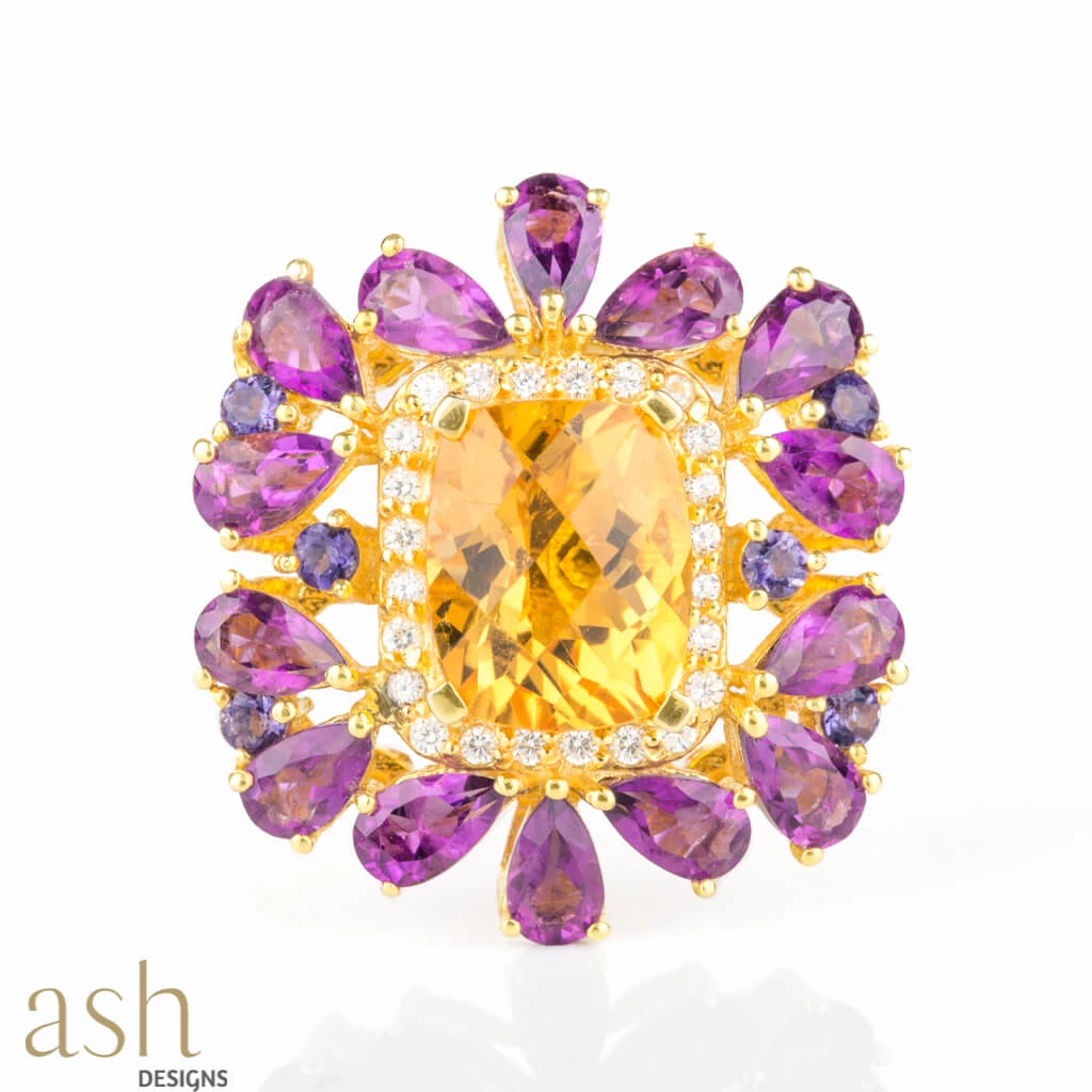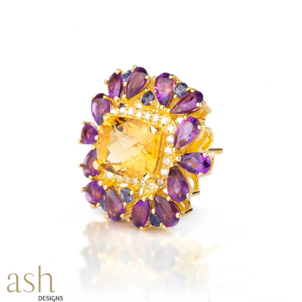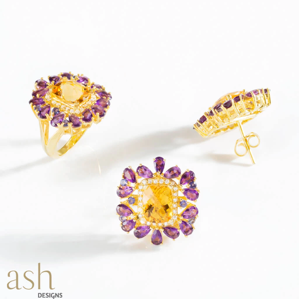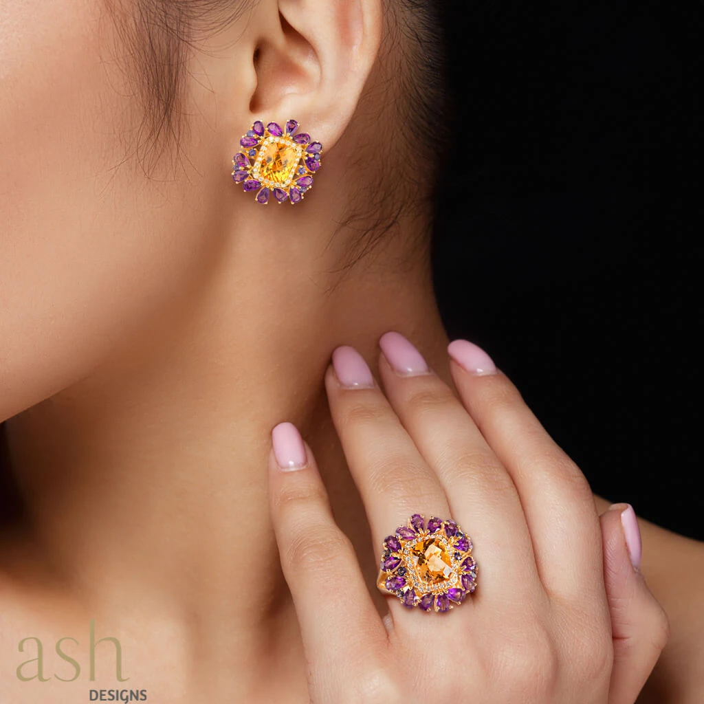 Inspired by the colour burst in the twilight sky, this duo of amethyst and citrine stones, accentuated by iolites, brings to life the aura of nature. The earrings are set in 14K gold plated silver which is sure to bring a twinkle in one’s eye. These beautiful pieces can be worn for a formal event or a brunch out with friends. Surprise your wife or girlfriend on her birthday with this beautiful gift.