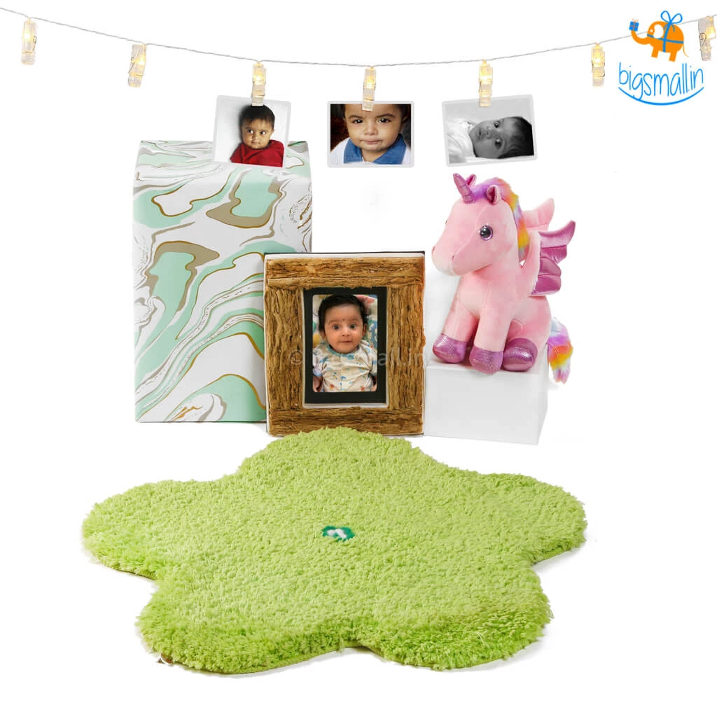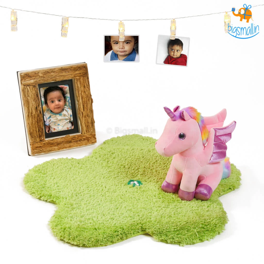 1 x Photo Clip String LED Lights, 1 x Unicorn with Wings Plush Toy, 1 x Green Star Bathroom Rug, 1 x Wooden Antique Photo Frame
