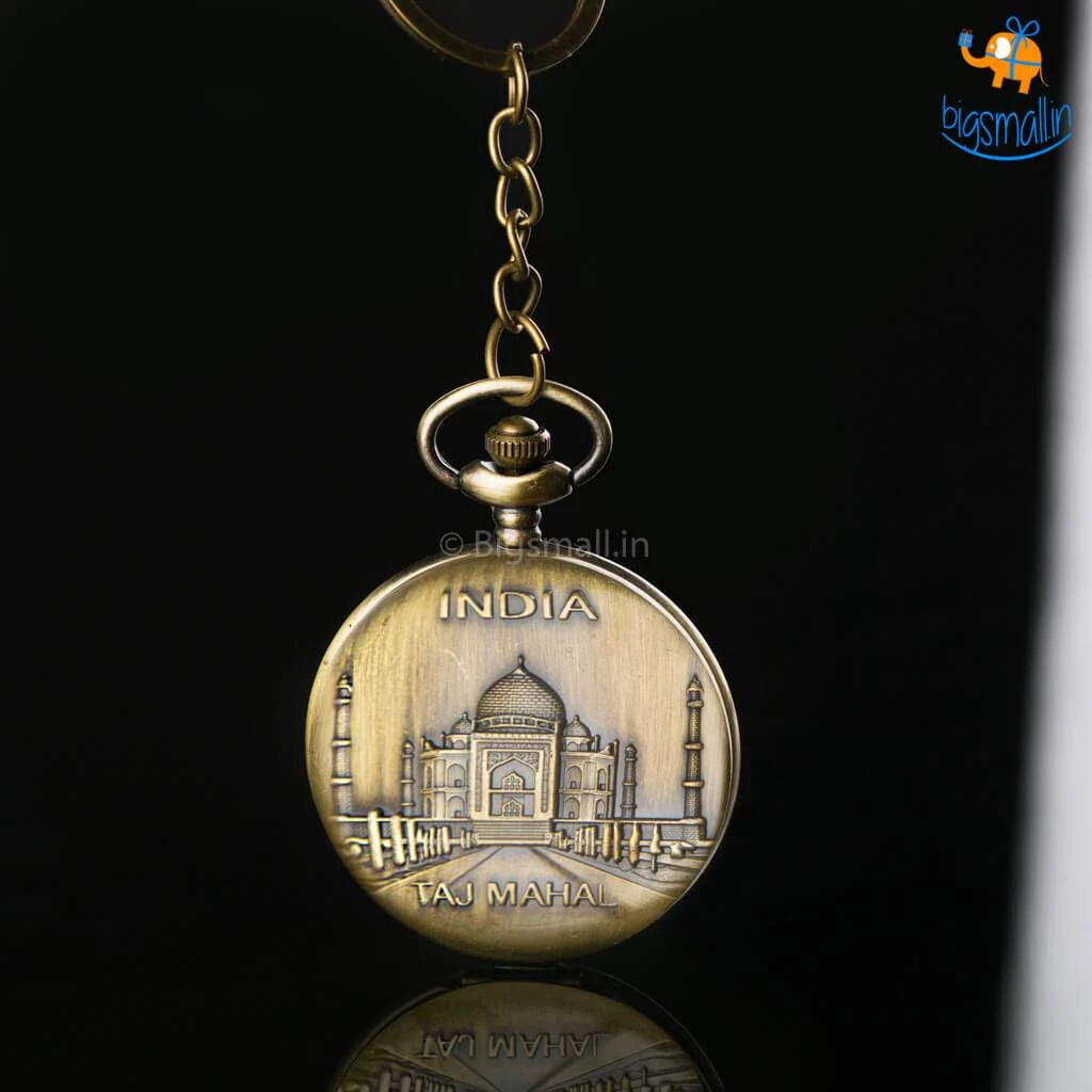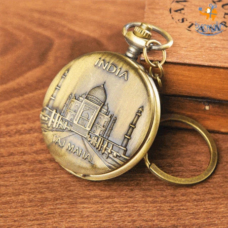 “The Taj Mahal rises above the banks of the river like a solitary tear suspended on the cheek of time.” An apt description by the Bard of Bengal, one finds its timeless beauty reflected in the Vintage Monument of Love Keychain With Pocket Watch. It serves as the perfect gift or souvenir for when you are looking for something that embodies taste as well as class. The keychain itself has a rustic bronze feel to it while the pocket watch is timeless art enframed in a beautiful collectible. Make a gift of this classic souvenir to a visiting friend or relative or maybe order one for yourself to gaze at lovingly from time to time.