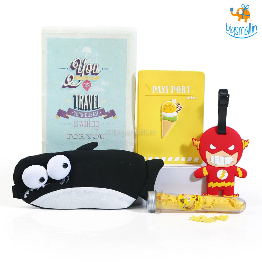1 x All You Need Is Travel Journal, 1 x Doodle Passport Cover, 1 x The Flash Luggage Tag, 1 x 3D Shark Eye Mask, 1 x Portable Paper Soap