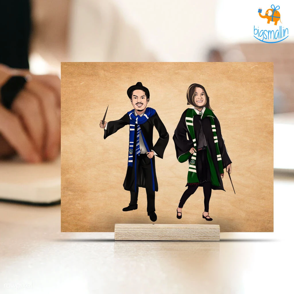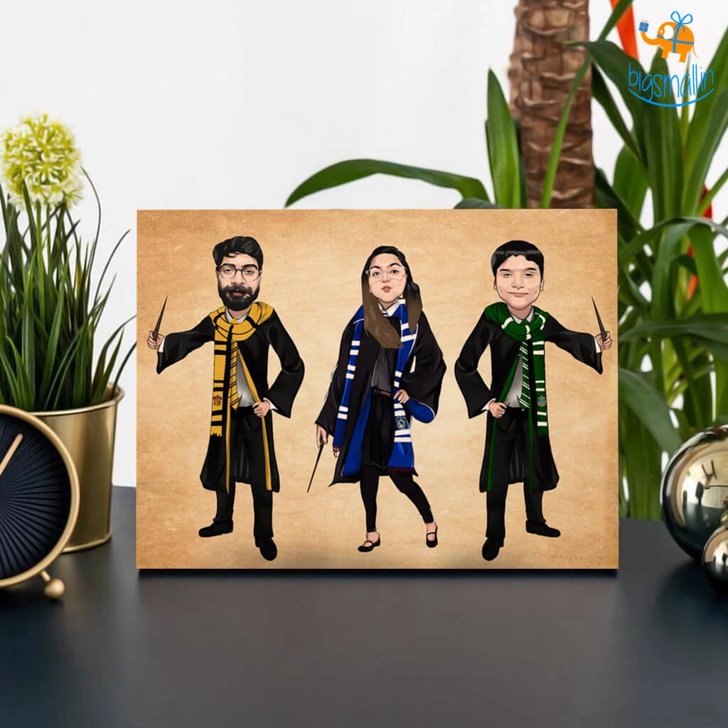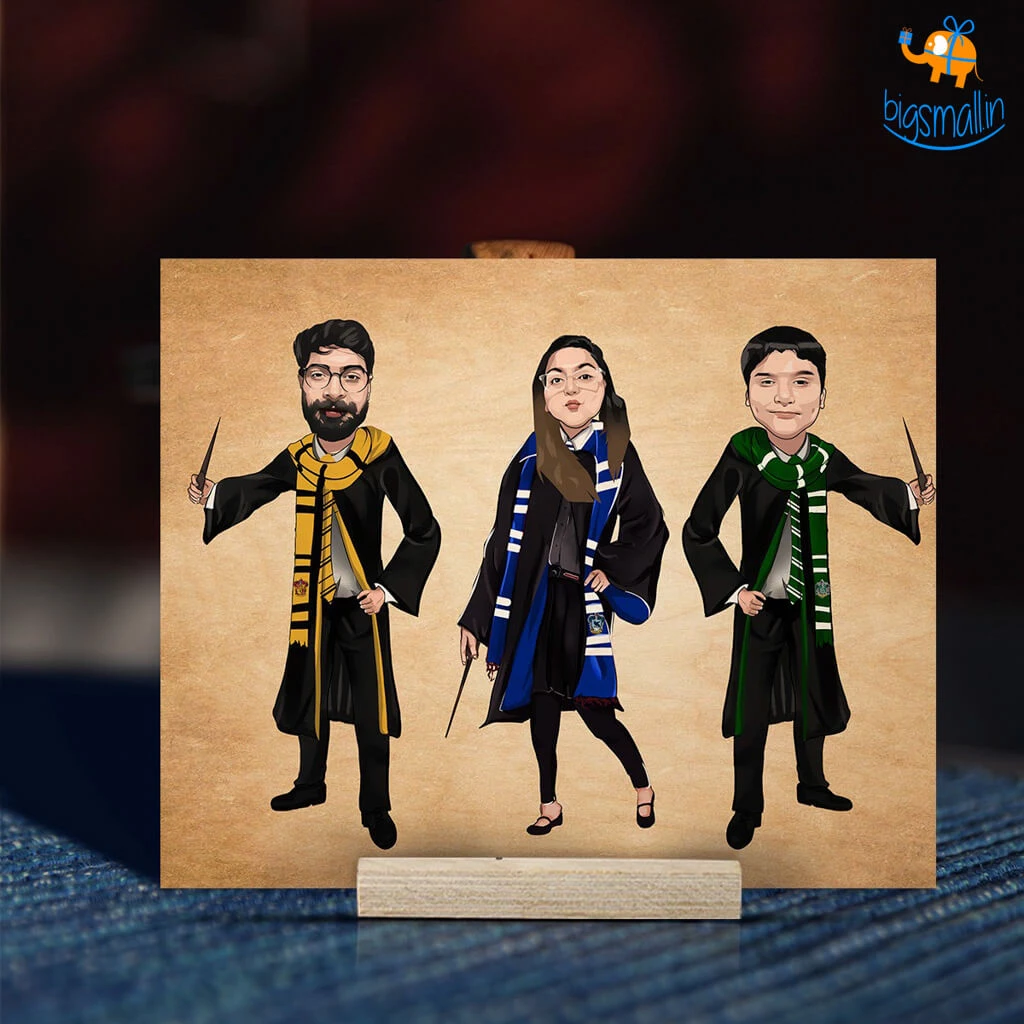 Do you wish you were a part of Hogwarts? Studying about dark potions and watching Harry get into trouble? Bored of your muggle life? Well, the Personalized Harry Potter Caricature Wooden Portrait is here to make you feel like a fun part of the wizard school! It is a freestyle vector art where you send us your best photo and we transform it into a cartoon avatar. The body remains the same but the face gets the caricatured aspect and becomes apt to be a fun wall art piece. The caricatures are then printed on a wooden frame. The ideal gift from the Harry Potter collection, a must have for every Harry Potter fan. Buy Harry Potter theme gift right here for your true wizard buddy.Â