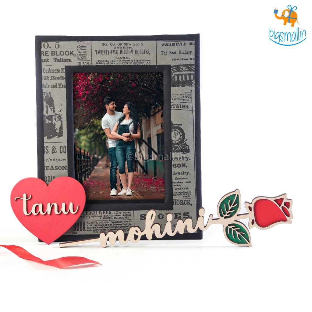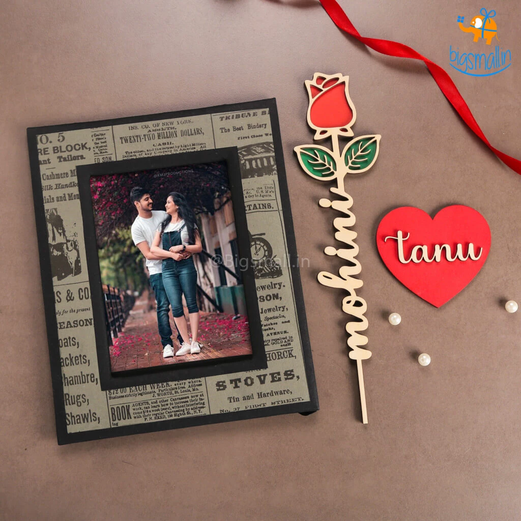 1 x Personalized Wooden Rose, 1 x Vintage Style Photo Frame, 1 x Personalized Heart Name Wooden Fridge Magnet