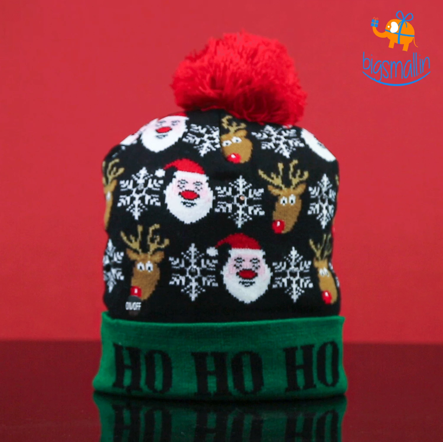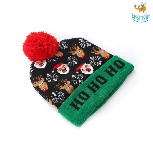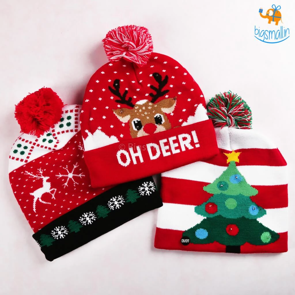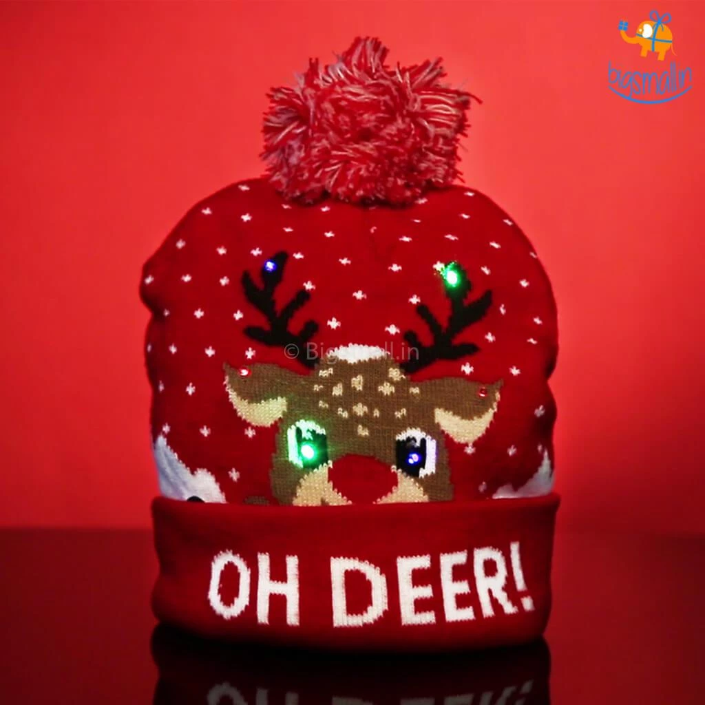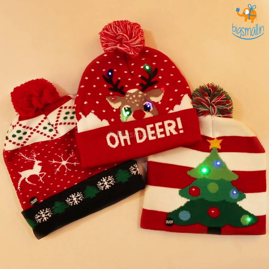 The year-end is the time to snuggle up and drink a lot of cocoa. We at bigsmall.in present these quirky caps with LED lights in them. The cap is made of superior knitted fabric, it is soft, warm and stretchable. A unique gift for kids and adults alike. It has an on/off button and the lights can be turned on in three different modes: Slow flash, strobe, steady on. Gift these adorable caps to your loved ones this Christmas season. There are two variants available: the Reindeer cap and the Christmas tree cap.