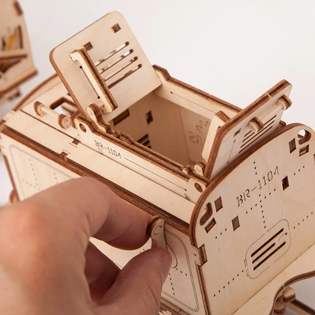 The number of components in the box is 443 pieces. The Locomotive with Tender Mechanoid Puzzle kit is made of sustainably sourced high-grade wood and has everything you might need for assembly. The quality of the parts is top-notch: a laser method is used for cutting items from a plywood board that provides precise hairline cuts. The details have to be pulled out of the boards and assembled to create a complete model. The product comes with an instruction manual in 11 different languages.Â
