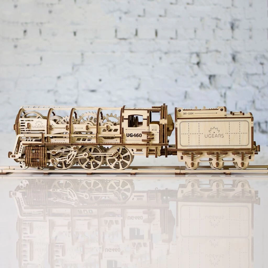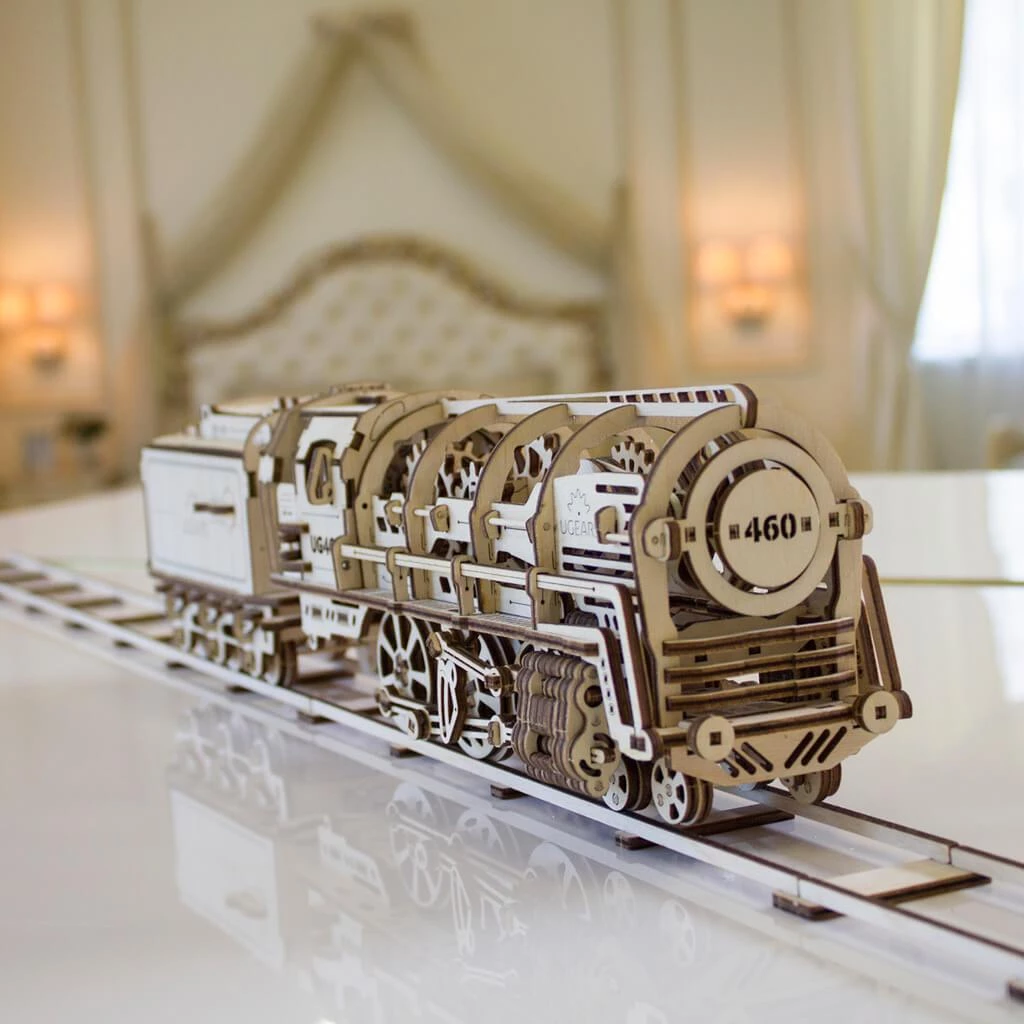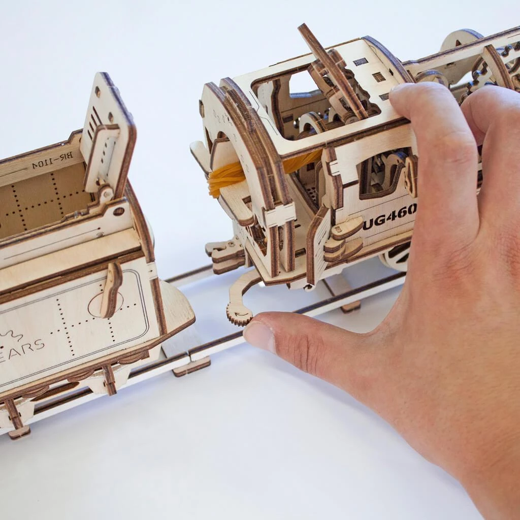 The UGEARS 460 Locomotive with Tender combines all of the technical and artistic innovations that builders have come to appreciate. Richly detailed with an eye toward realism and romance, our version of this indelible symbol of 19th-century technology and adventure captures the imagination of all who see it. Driven by a rubber band engine. It runs up to a distance of 5 metres and has three control modes: forward, backward, and idle.Â