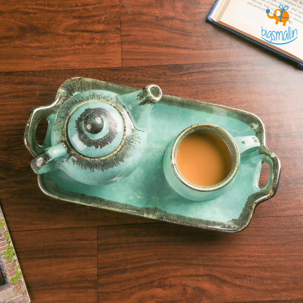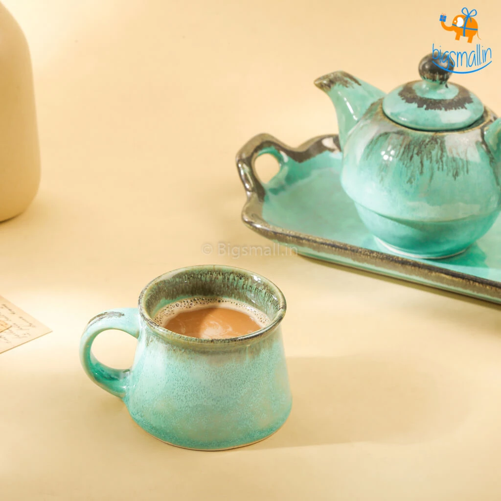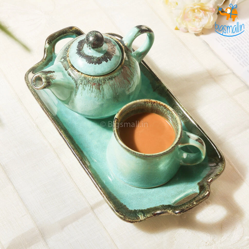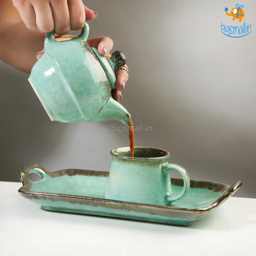 The Rusty Turquoise Teapot and Cup, is the most aesthetically pleasing delight you could possibly find. Handmade with the magic of the shade that is the sea, it is a masterpiece. A breathtakingly beautiful design, it is printed in greenish-blue wash with an elegant finish. The set includes a teapot, a tea cup and a tray. They make for a fancy yet minimal present that anyone would love to add to their collection of kitchenware. If you love having varied crockery at home, this set will definitely take your mood, and your tea party up a notch.