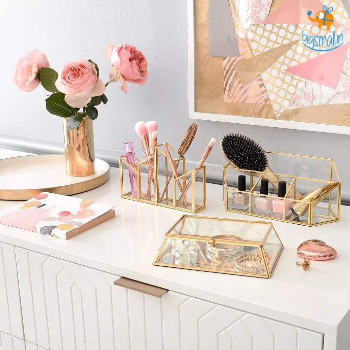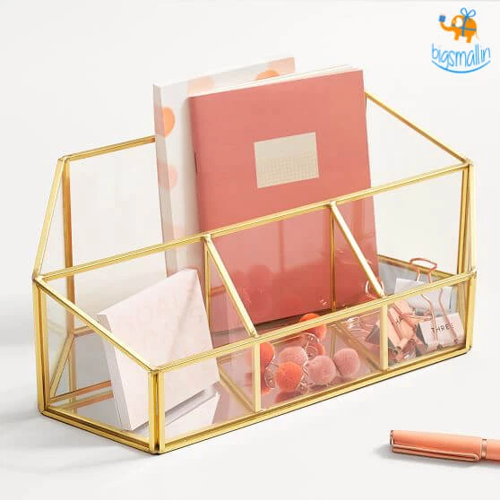 Introducing a sleek and stylish, yet with incredible storage – Glass Desk Organizer. This multi-purpose organizer helps you declutter your storage space, organize your belongings & serves as a great décor item in any room. The mirrored bottom and brass edges enhance the overall look of the piece. It makes for a great gift to a loved one who loves decluttered shelves and cabinets.