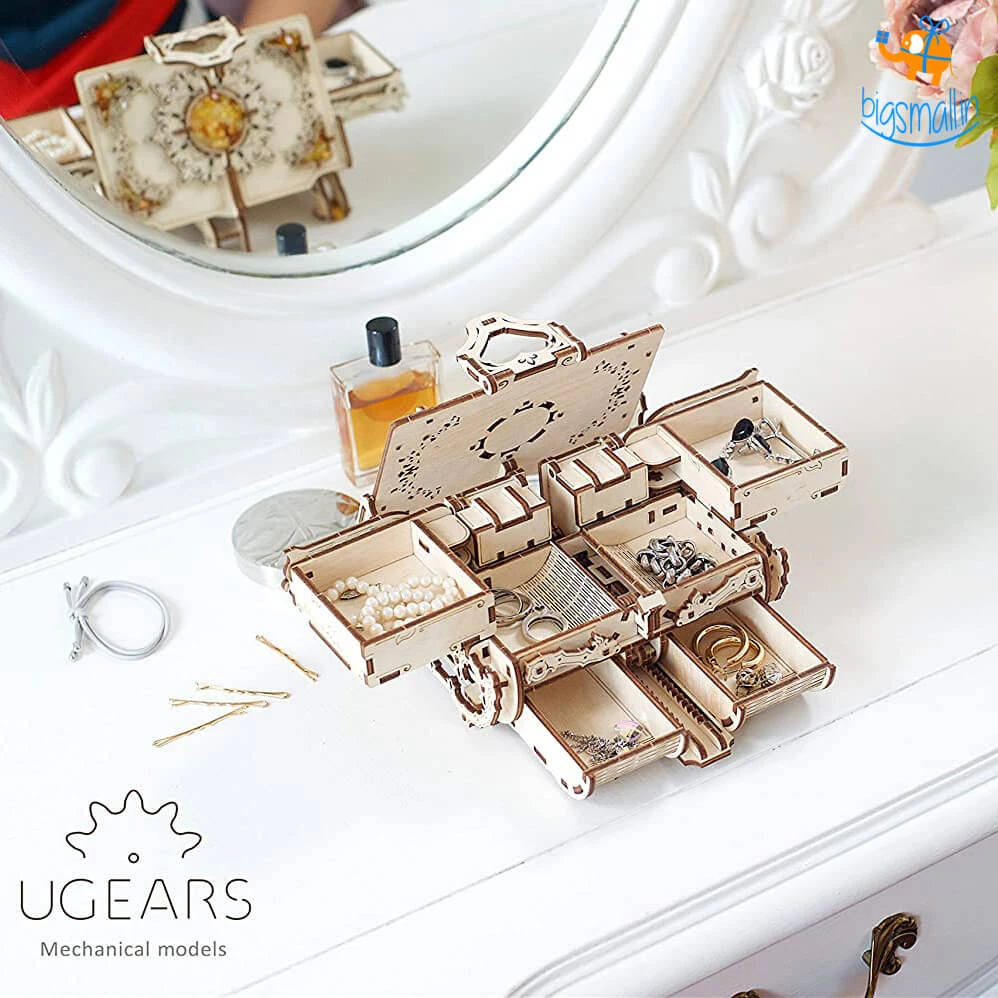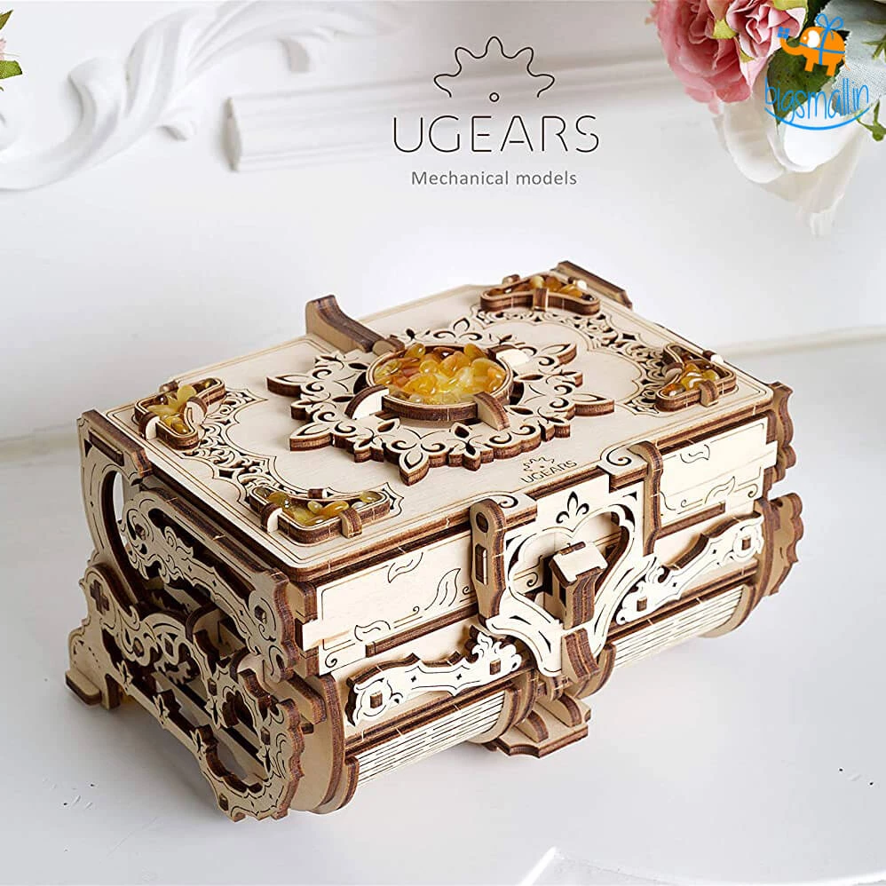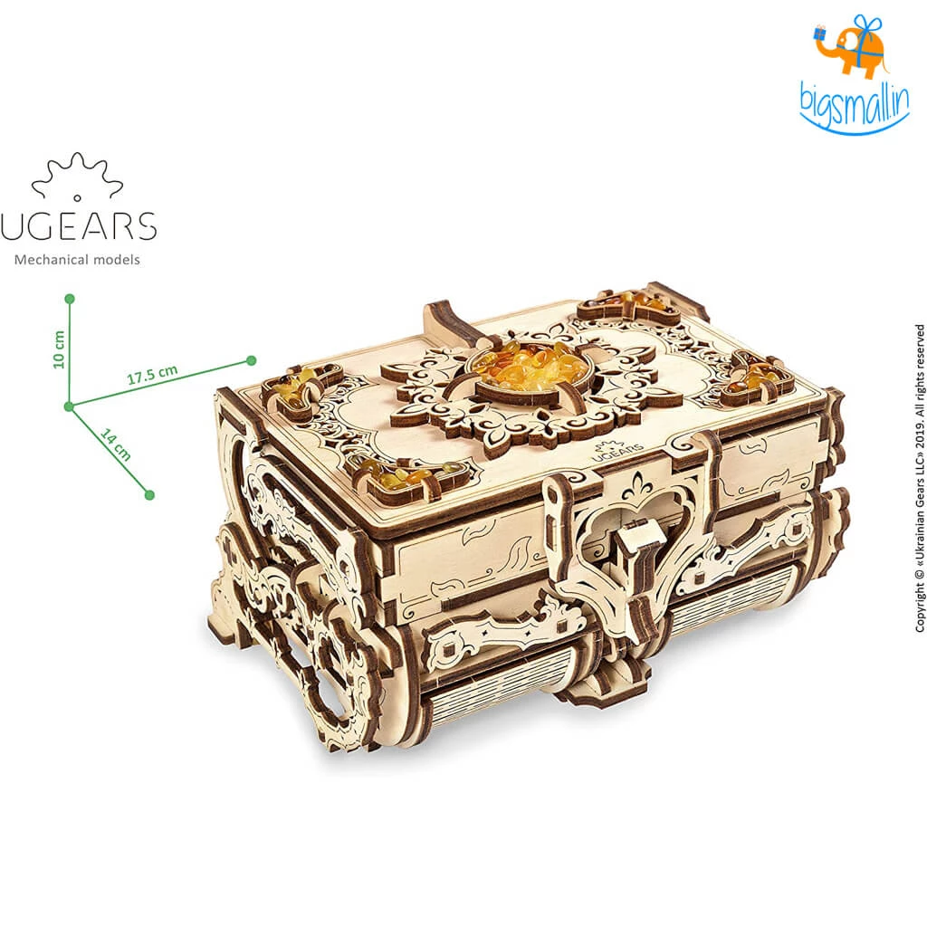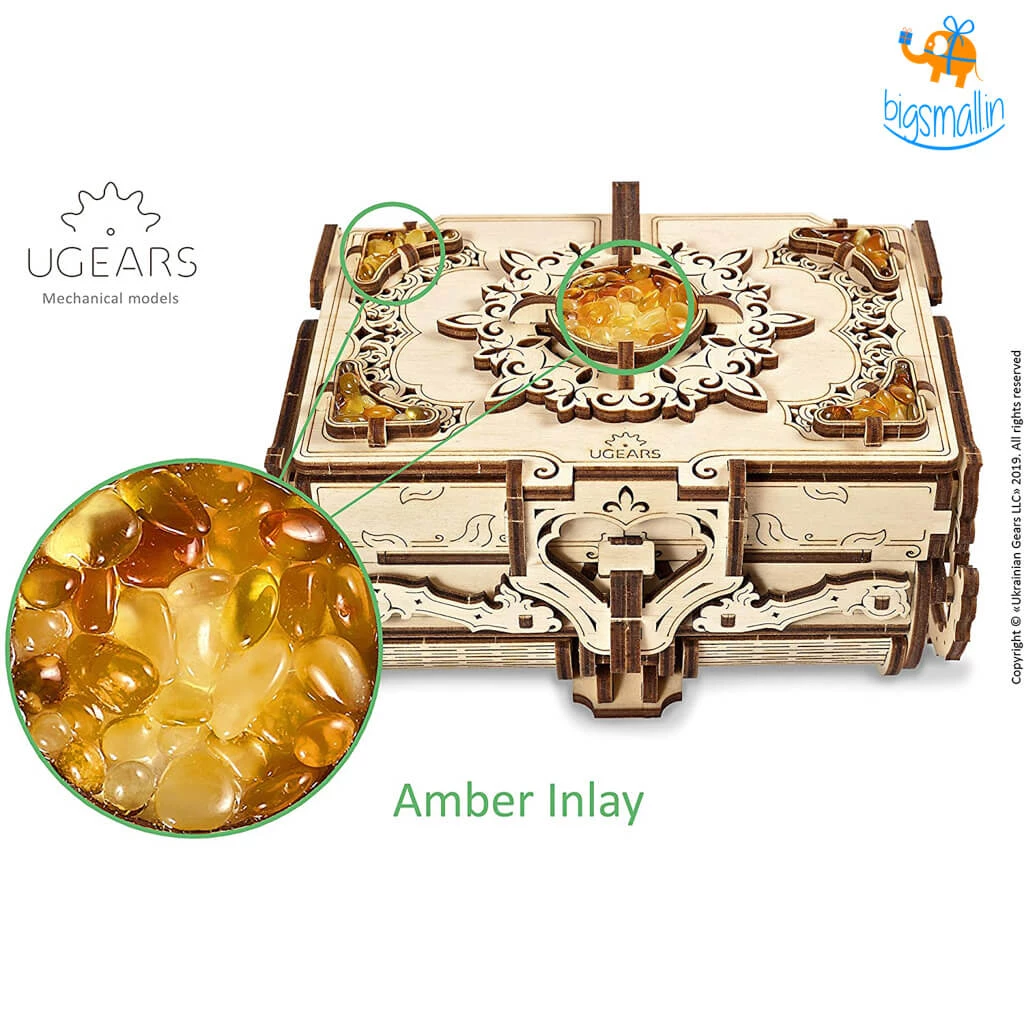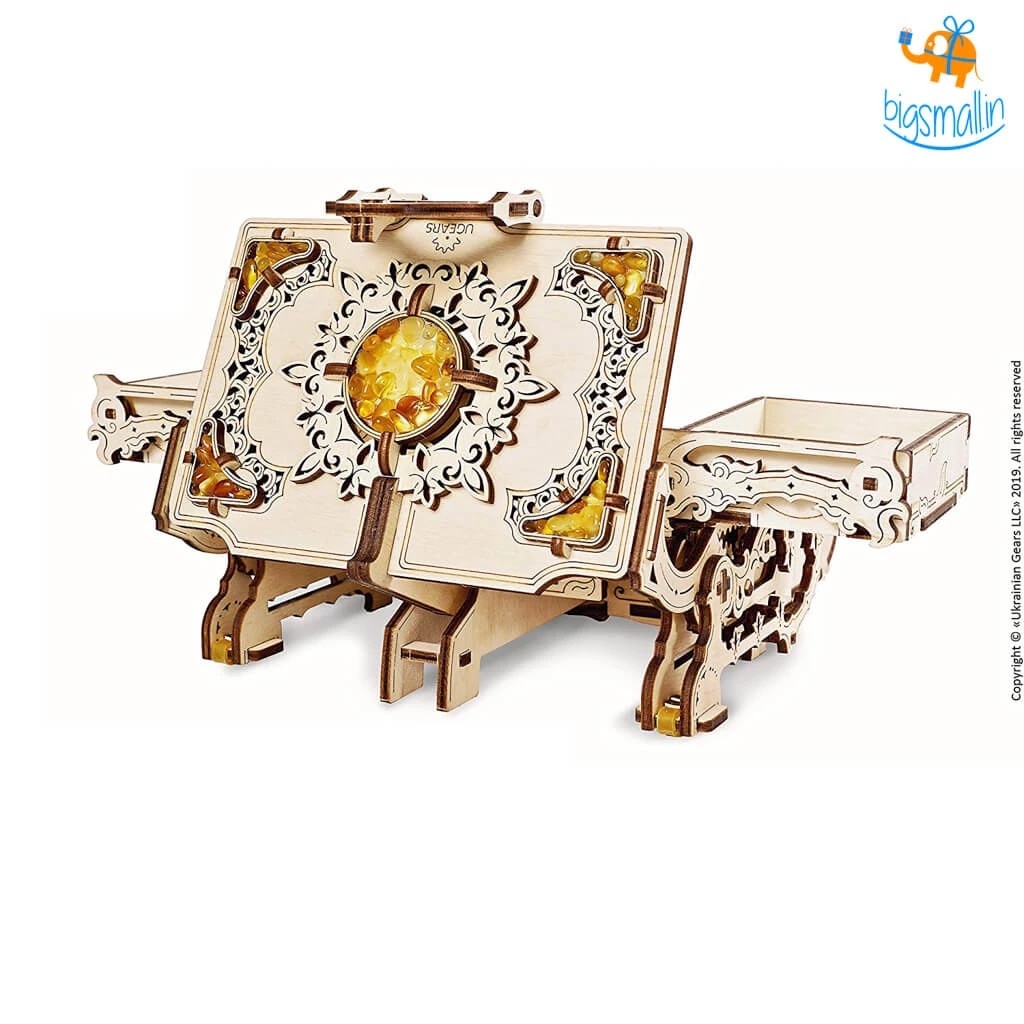 Ugears Amber Box Mechanical Puzzle is more than a puzzle as it includes a smart mechanism. To set it in motion, you need to pull the lid that will activate three main blocks: two of which are mirrored mechanisms on each side that move and turn the upper compartments. The third mechanical block moves the lower drawer in the middle of the Box. This step will grant you access to six compartments. Take it a step further and you will find two extra secret compartments. To discover those you need to feel the hidden button concealed on the backside of the box – to accommodate your most valued treasures. The lid has a locking latch that keeps contents inside from spillage in transportation or in case of accidental tipping over. An exquisite gift to somebody special or a true treasure of your own collection, get it today.