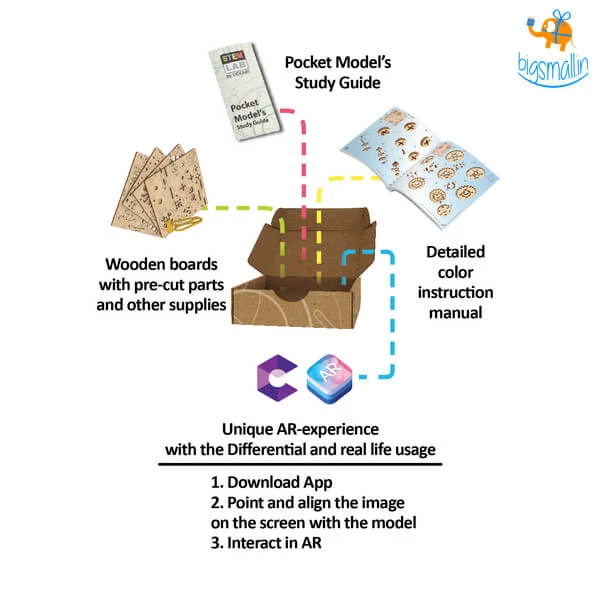 After significant upgradations by Ferdinand Porsche in the car differential model in the 1930s, the differential has become the part which improves the performance of a car by being a huge part of the car transmission mechanism. The Ugears Differential Mechanical Model brings together modernity and education with its Augmented Reality (AR) experience using the Ugears app. Along with that the Pocket Model’s Study Guide brings in the understanding of the creation story of the Differential while engaging you in interesting tasks.