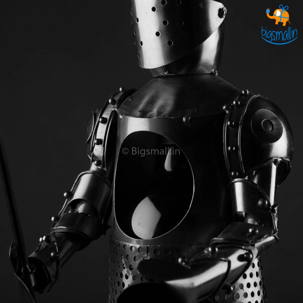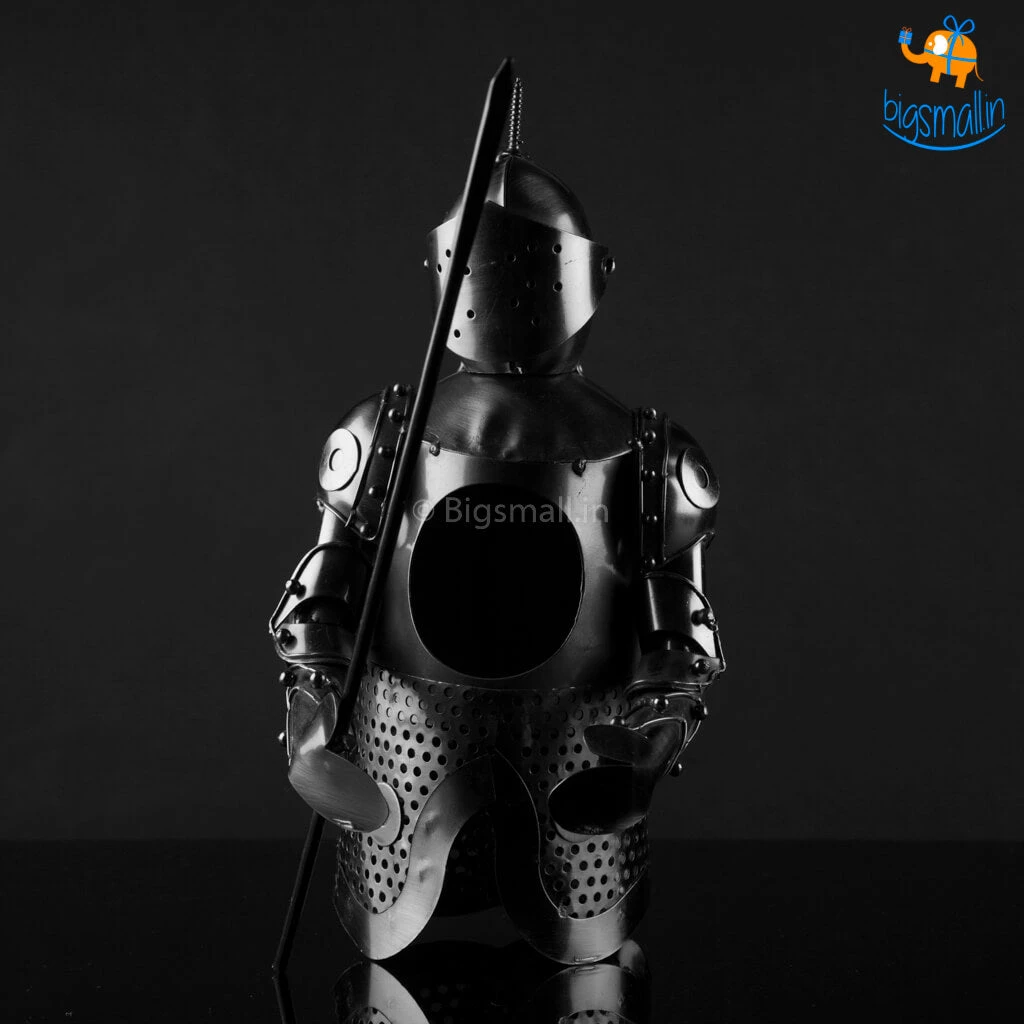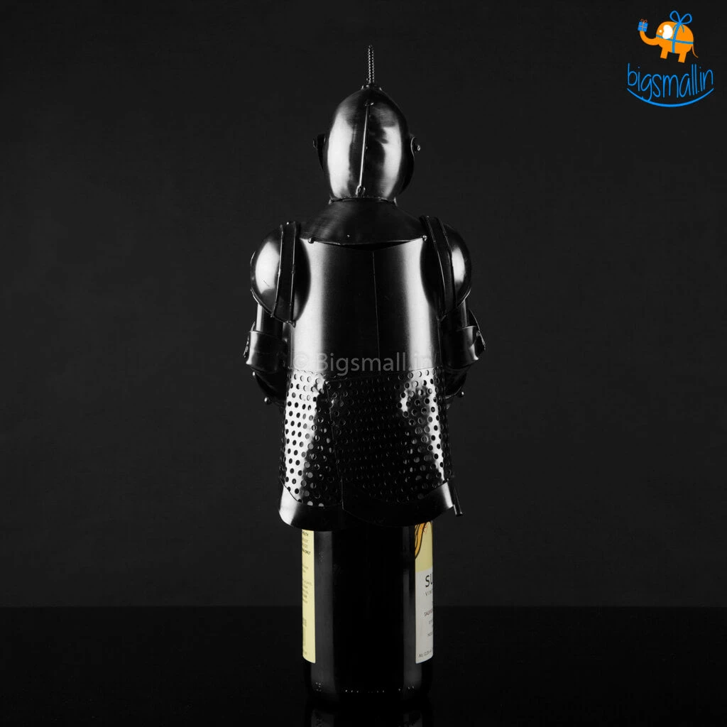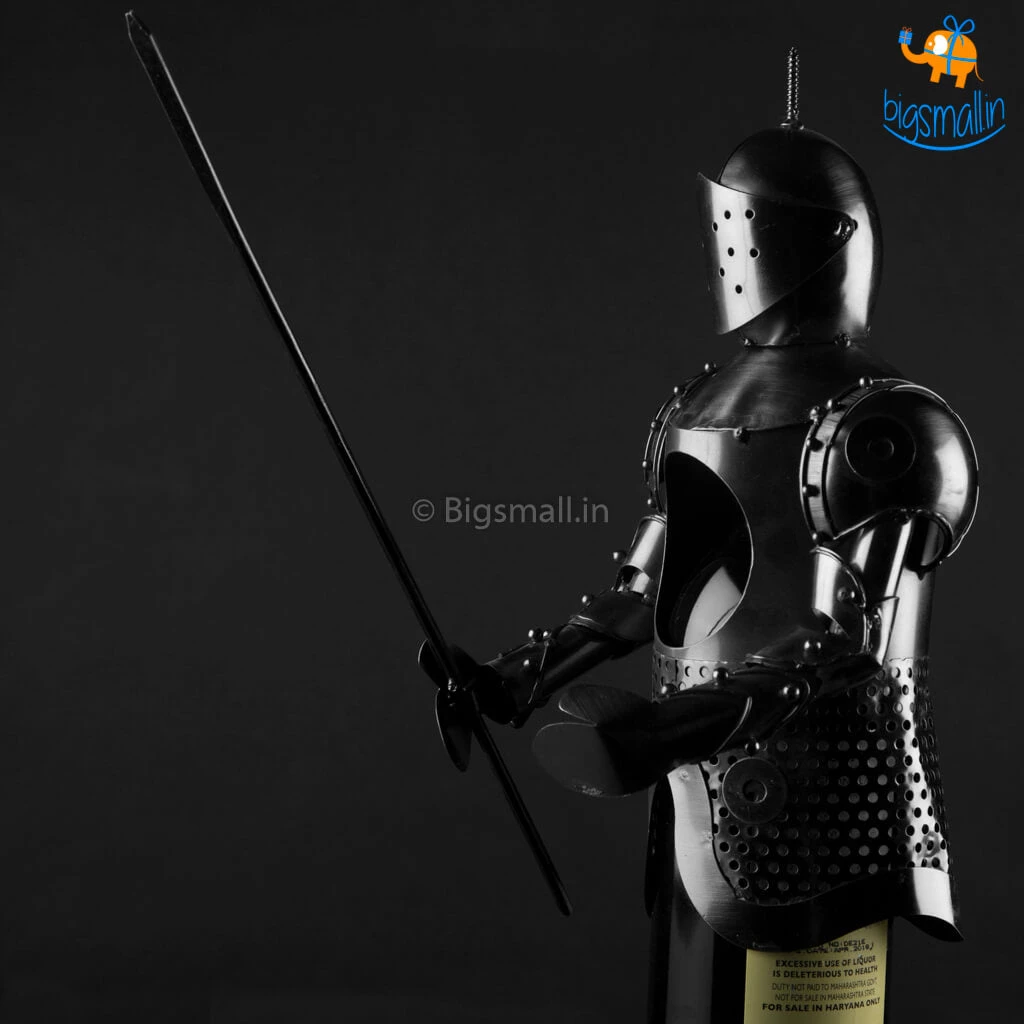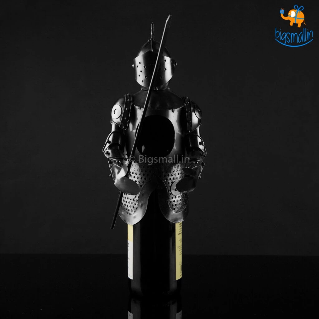 Store your favourite bottle of wine in this Metal Wine Bottle in the most creative way ever. Styled to look like a Knight in action with his blade sword in hand, this sworn in metallic Knight has pledged to protect your wine day and (k)night till eternity. This quirky decor item holds your favourite vintage in a fun and decorative accent. This metallic holder offers a functional yet personal touch of style to any decor. Crafted out of metal to create a unique and whimsical makeover of the simpleton wine cover. An interesting way to give a bottle of wine as a gift or to store it for yourself in a prudently aesthetic piece. Add a whimsical conversation piece to your table with this Knight Metal wine Holder.